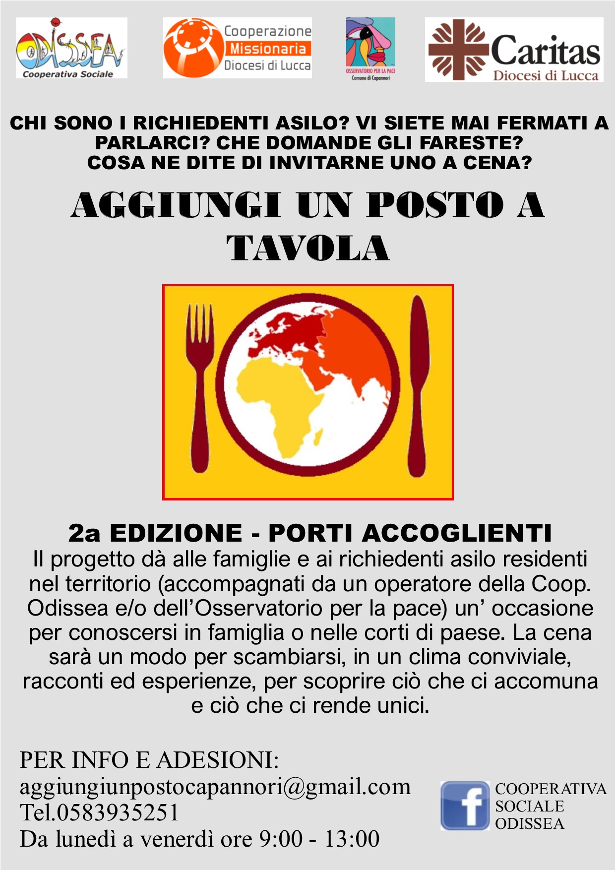 Una cena speciale contro l’indifferenza e l’emarginazione. Le famiglie di Capannori e della Piana lucchese possono invitare un richiedente asilo ospitato nel loro territorio. Al via la seconda edizione del progetto nato per favorire l’integrazione dei migranti promosso dalla Cooperativa sociale Odissea.