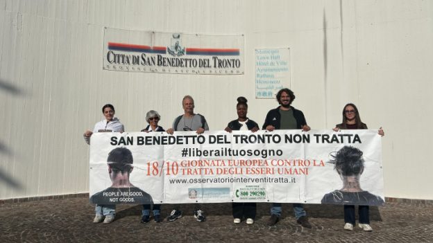 In occasione della Giornata europea contro la tratta di domani, cooperativa sociale On the Road e i suoi partner hanno voluto lanciare un messaggio chiaro e visibile: davanti ai palazzi comunali di San Benedetto del Tronto e Pescara è stato esposto lo striscione con la scritta “San Benedetto del Tronto non tratta” e “Pescara non tratta” contro ogni forma di sfruttamento.